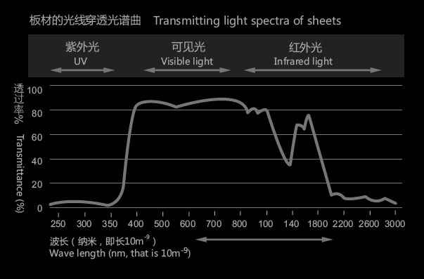 下圖為陽光板的透光光譜圖,從圖上可以看出,波長短于350nm的紫外線幾乎不穿透陽光板。